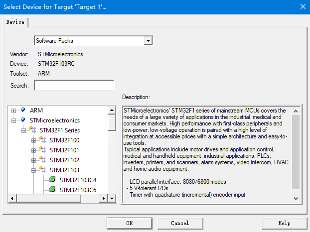点击保存后会弹出对话框,选择自己要使用的芯片型号,如图: 此处我选择STM32F103RC,点击 OK