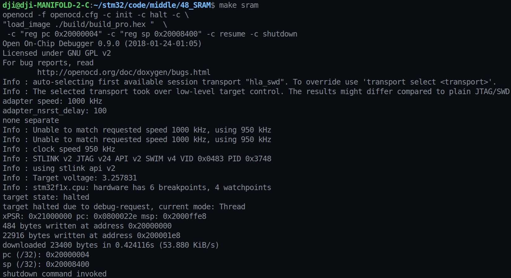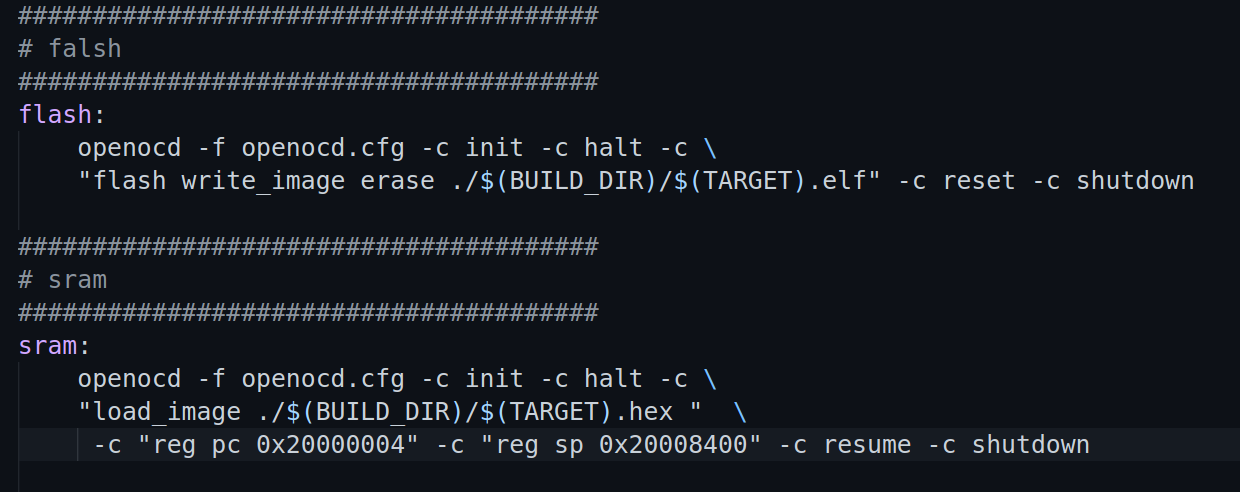 在终端输入make sram 就可以将代码烧录进ram,进行运行。 我们强制更改了pc指针地址和sp的指针地址,可以在flash模式下直接烧录进入ram