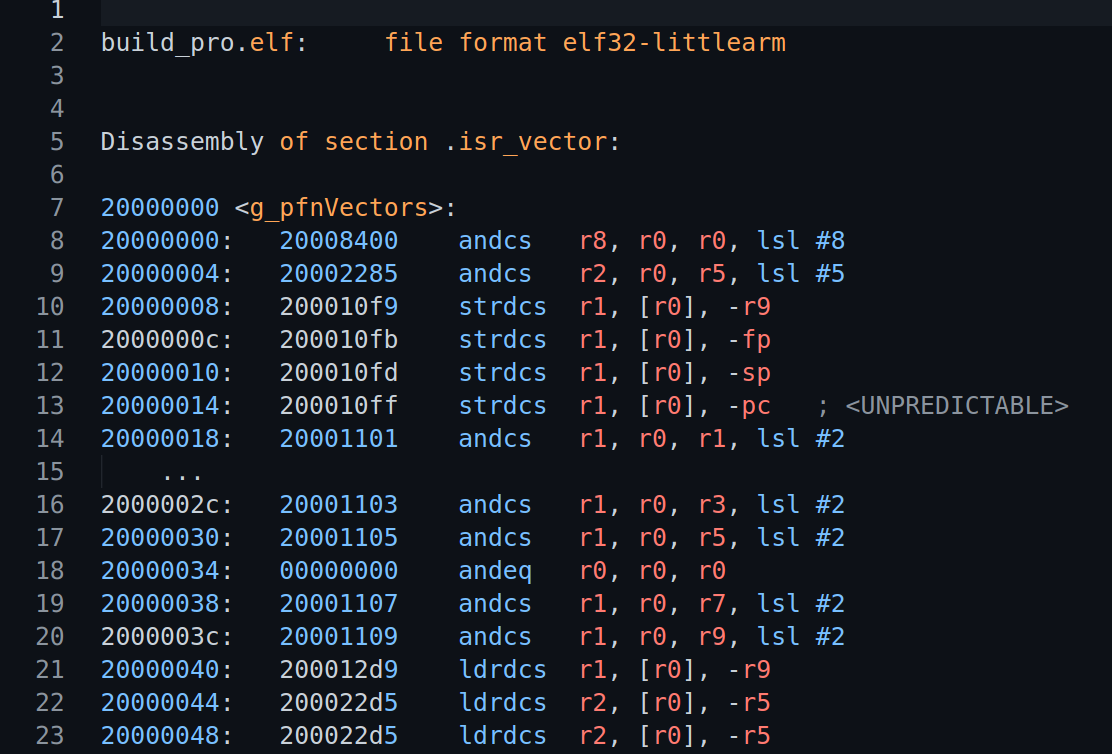 然后通过makefile文件编译代码生成elf,我们可以反汇编elf看到,程序的text段 data段 bss 段都分布在0x20000000开始的地址了  下来通过在makefile文件中 使用此段代码,就可以将生成的代码烧录进入stm32 内部ram程序,并且使程序可以运行  此图中sram 代码 为进入 ram 空间