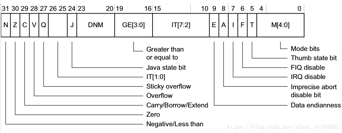 N | Z | C | V | Q | Res | J | Reserved | GE[3:0] | Reserved | E | A | I | F | T | M[4:0] |