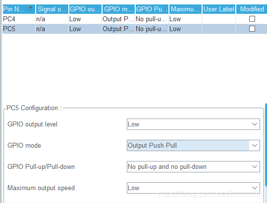1.首先是接线中用来控制M1和M2的两个IO口的输出配置,这里我使用的是PC4和PC5