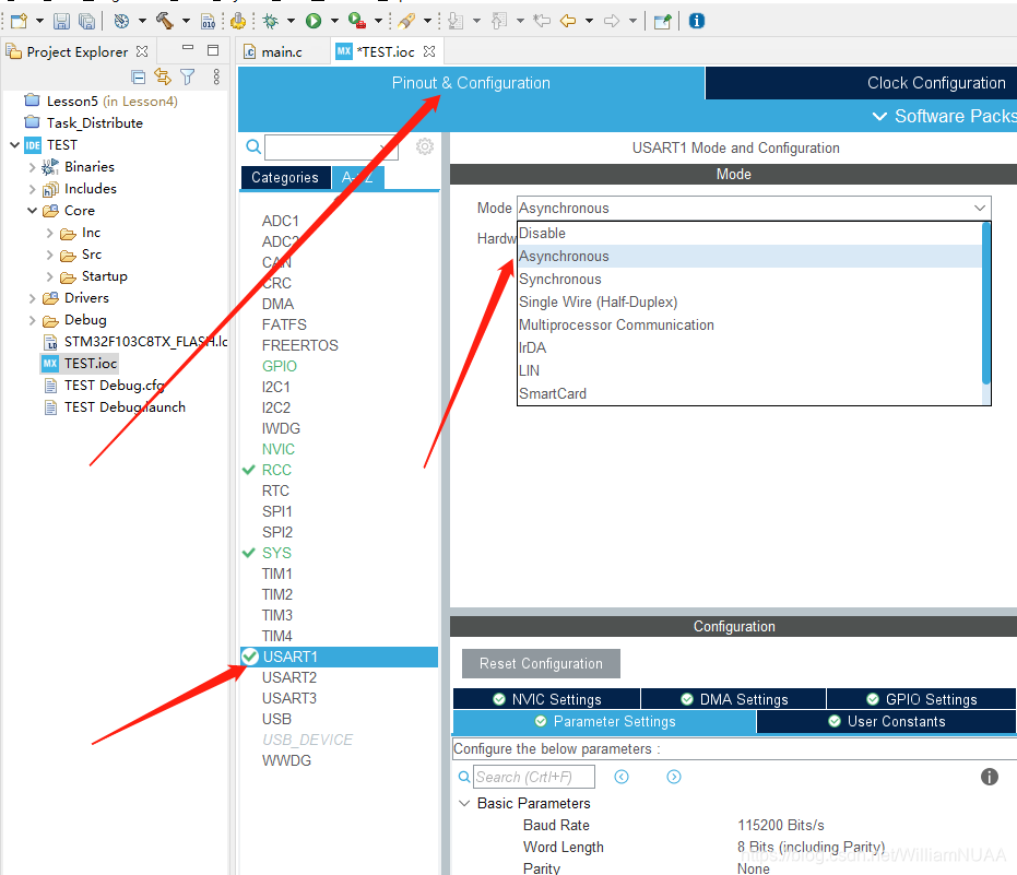 1.新建一个项目文件,选择在左侧Pinout&Configuration 界面中点击USART1,然后在 USART1 Mode and Configuration 的 Mode 中选择Asynchronous。