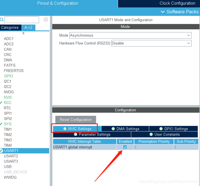 2.点击NVIC Setting,对USART1 global interrupt 的选择框打钩,启用USART1 的全局中断。