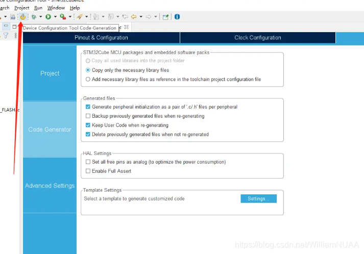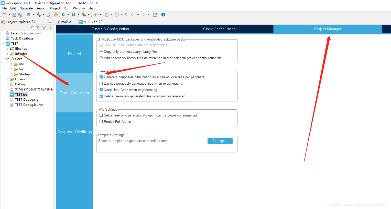 3.在Project Manager 的Code Generator 中勾选generate periheral initialization as apair of“.c/.h”files per periheral ,可以让每个外设都生成一个文件,不用全部都堆在Main.c 文件中。