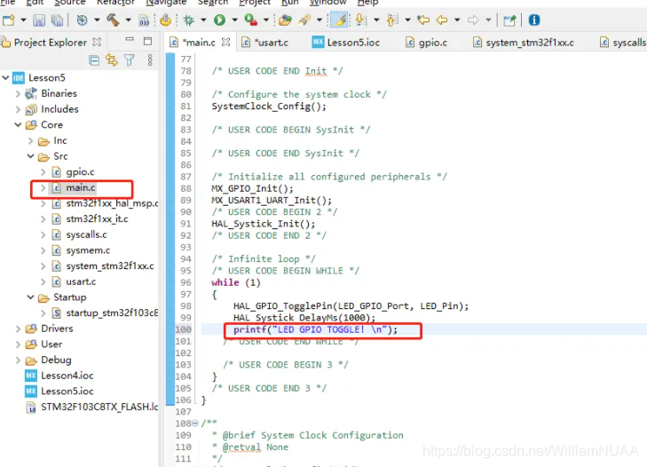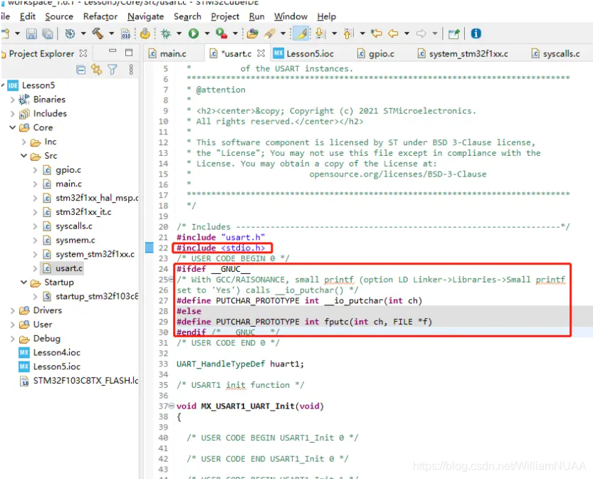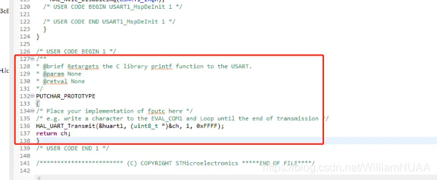 5.?打开usart.c,在/* USER CODE BEGIN 0 */ 和/* USER CODEEND 0 */ 把标准输入输入头文件 stdio.h 加进去(注意是在usart.c中加),并且加入以下代码: