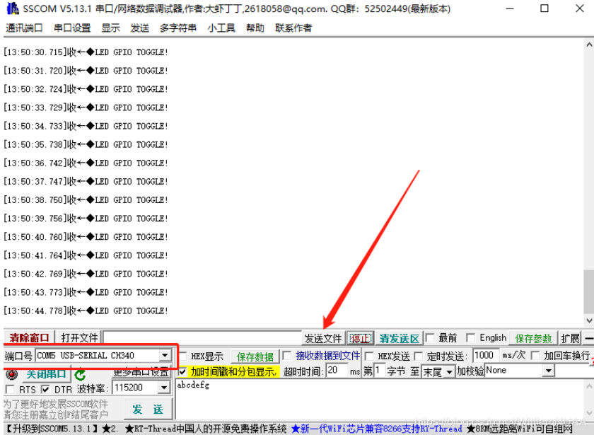 9.将小车用USB和电脑相连接,打开sscom软件,选择端口,接收在main.c文件中设置输出的字符。