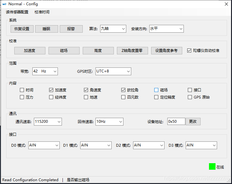 我们在第一次使用时,记得将陀螺仪水平,然后点击加计校准,来校准陀螺仪。  我们在上位机中点击配置去修改一下陀螺仪的一些配置参数。  这里我将默认9600的波特率改为115200,将陀螺仪发送的内容改为只发送加速度,角速度,欧拉角。 其中加速度的类位为0x51,角速度为0x52,欧拉角为0x53