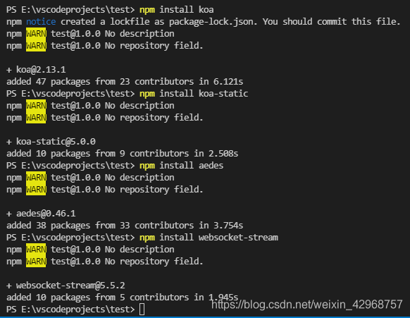我们需要安装的依赖包有aedes 、koa 、koa-static 、websocket-stream这四个依赖包就够了。当然如果功能更复杂的话,可能需要更多的依赖包,但基于我们的目标,将nodemcu发布的mqtt话题的信息上传到web网页端,这四个依赖包就能完成。如下指令, PS: 有的教程会加上–save,其实可以不加,因为从npm5.0版本后,安装的包的信息都是默认添加到package.jason文件中的。