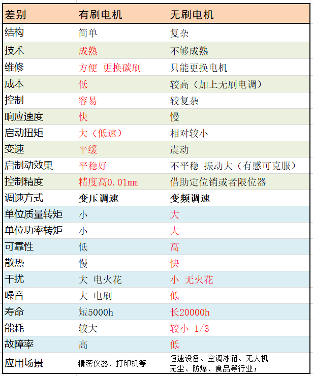 ?总而言之,有刷电机与无刷电机各有各的优缺点,主要根据应用场合和实际需求来选择,总结如下表所示: ?