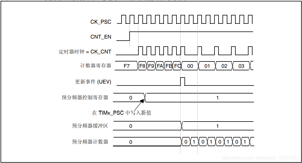 数据手册介绍预装载寄存器的内容可以随时传送到影子寄存器,即两者是连通的(permanently),或者在每一次更新事件(UEV)时才把预装载寄存器的内容传送到影子寄存器。事件只有更新到影子寄存器后才会发生。