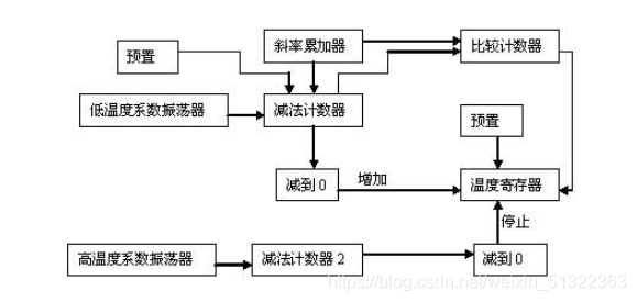 DS18B20的读写时序和测温原理与DS1820相同,只是得到的温度值的位数因分辨率不同而不同,且温度转换时的延时时间由2s减为750ms。 DS18B20测温原理如图3所示。图中低温度系数晶振的振荡频率受温度影响很小,用于产生固定频率的脉冲信号发送给计数器1。高温度系数晶振随温度变化其振荡频率明显改变,所产生的信号作为计数器2的脉冲输入。计数器1和温度寄存器被预置在-55℃所对应的一个基数值。计数器1对低温度系数晶振产生的脉冲信号进行减法计数,当计数器1的预置值减到0时,温度寄存器的值将加1,计数器1的预置将重新被装入,计数器1重新开始对低温度系数晶振产生的脉冲信号进行计数,如此循环直到计数器2计数到0时,停止温度寄存器值的累加,此时温度寄存器中的数值即为所测温度。斜率累加器用于补偿和修正测温过程中的非线性,其输出用于修正计数器1的预置值。