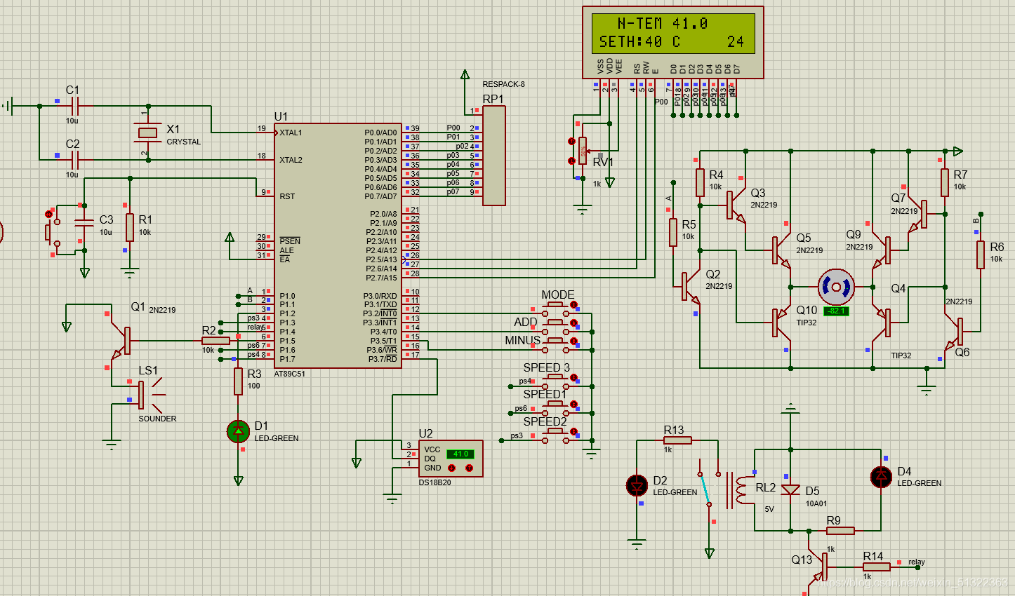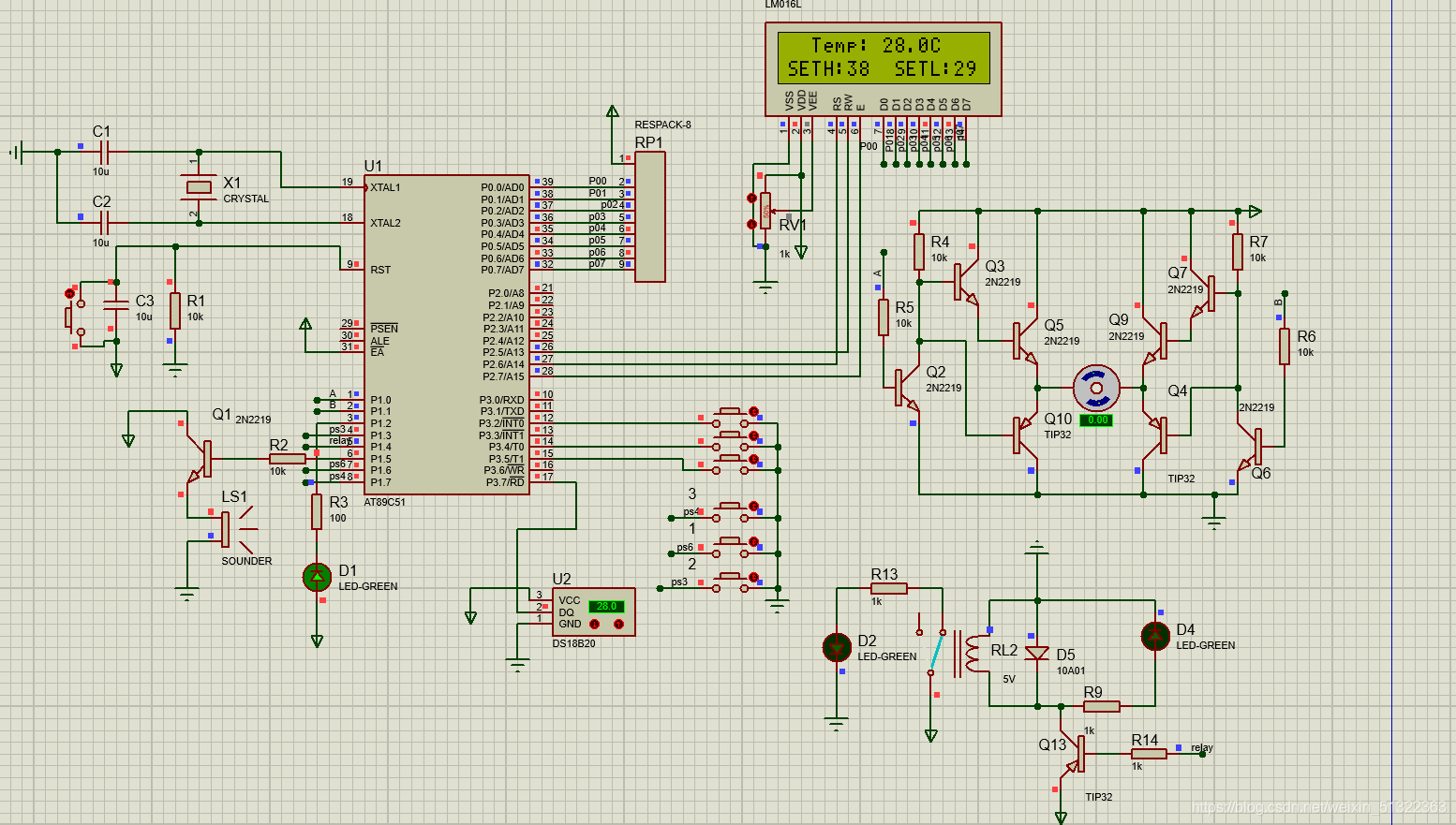 ? ?本设计采用AT89C51单片机为控制芯片,硬件上用dsb18202做温度采集(有需要也可以采用dht11温湿度模块)直流电机作为降温风扇,用户可通过按键来控制转速的大小,用继电器来控制电阻丝提高温度。用lcd1602显示屏来显示环境温度并且通过按键来设置模式与最高温和最低温。