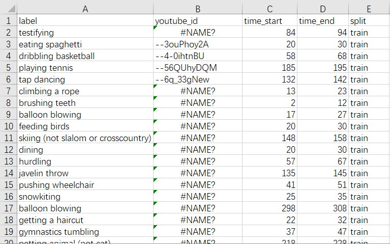 这里的csv格式的标注文件比官网上的标注文件多了一列,在自己写脚本解析生成kinetics400_train_list_videos.txt和kinetics400_val_list_videos.txt清单文件时可以忽略掉,另外这些文件里面有些文件的youtube_id没有,可以根据视频文件来反查csv解析出来的字典数据,这样就可以忽略掉这些有问题的数据。