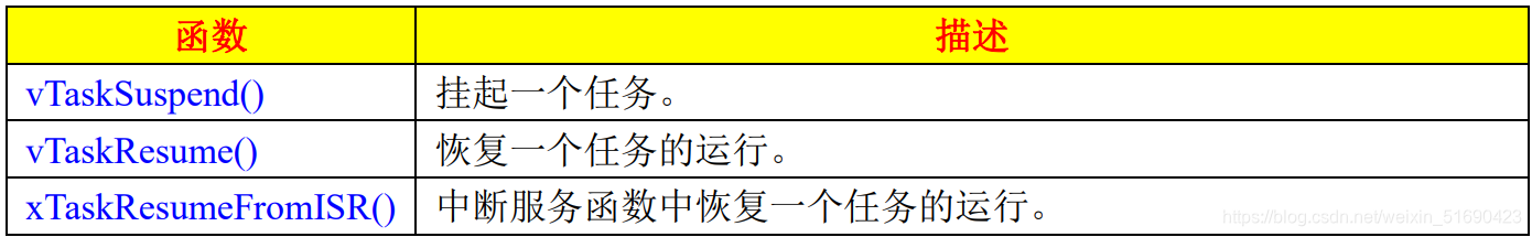 此函数是vTaskResume()的中断版本,用于在中断服务函数中恢复一个任务
