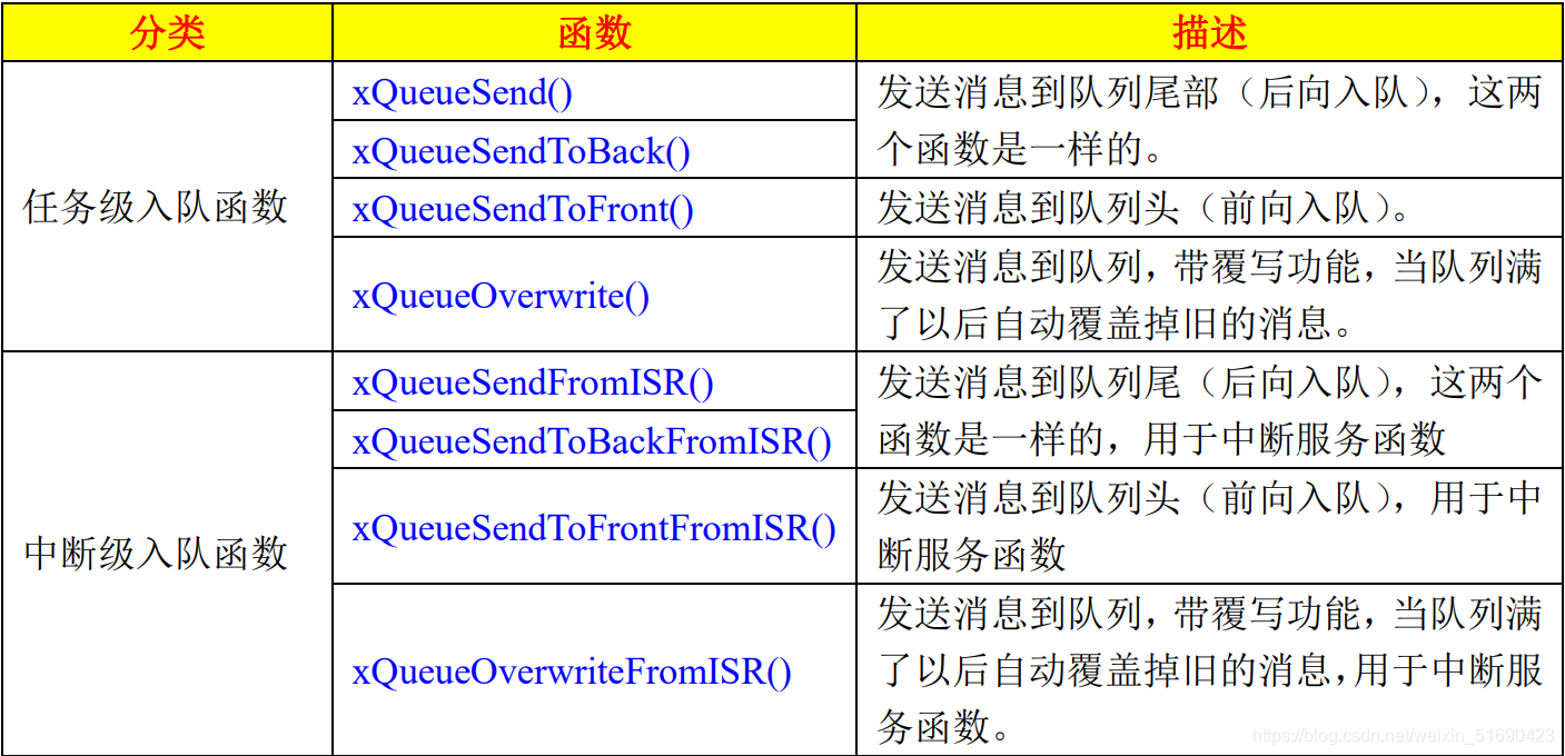 - xTicksToWait:阻塞时间,此参数指示当队列满的时候任务进入阻塞态等待队列空闲的最大时间。如果为0的话当队列满的时候就立即返回;当为portMAX_DELAY的话就会一直等待,直到队列有空闲的队列项,也就是死等,但是宏INCLUDE_vTaskSuspend必须为1