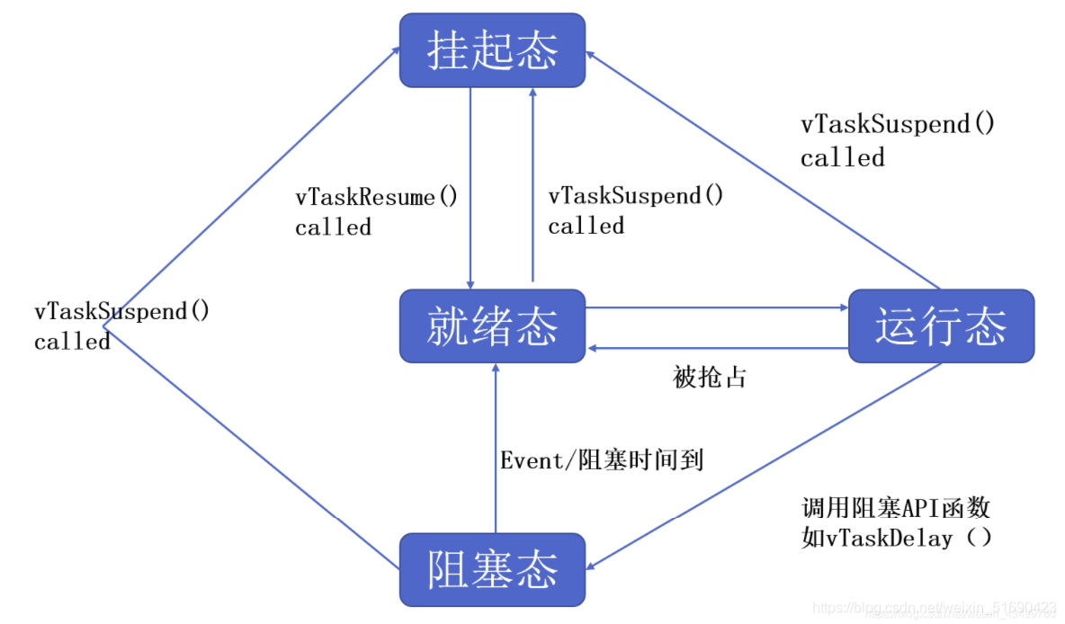 - 任务:也称作一个线程,是一个简单的程序。每个任务被赋予一定的优先级,有它自己的一套CPU寄存器和自己的栈空间。典型地,每个任务都是一个无限的循环,每个任务都处在以下五个状态:休眠态、就绪态、运行态、挂起态、被中断态