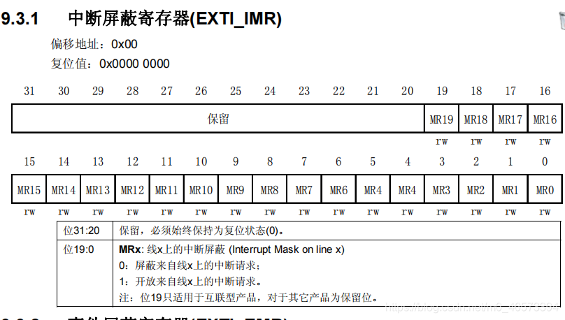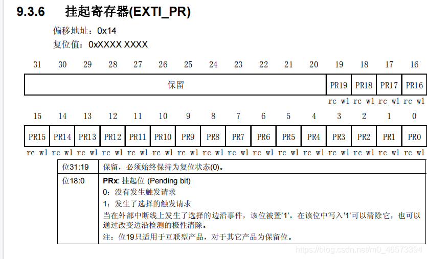 先看一下挂起寄存器,当检测到中断发生时,PR3会置位1,我们检查该为,如果为1则执行中断处理函数,在处理完之后便将该位写1进行清除。