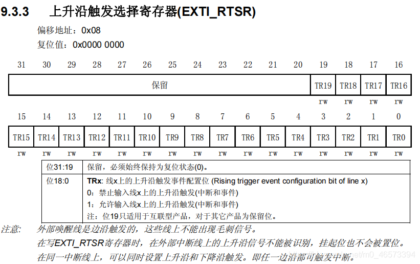 因为我们使用的是人体红外,所以在检测到有人时,会从0跳变到1,因此我们需要设置其触发方式为上升沿触发,其寄存器如下: