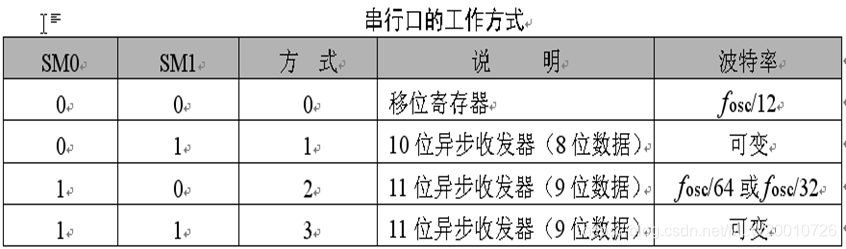 2,配置? ? ? ? ? ? ? ? ? ? ? ? ? ? ? ? ? ? ? ? ? ? ? ? ? ? ? ? ? ? ? ? ? ? ? ? ? ? ? ? ? ? ? ? ? ? ? ? ? ? ? ? ? ? ? ? ? ? ? ? ? ? ? ? ? ? ? ? ? ? ? ******SM0和SM1:SM0和SM1为工作方式选择位,可选择一下四种工作方式,通常使用方式1。? ? ? ? ? ? ? ? ? ? ? ? ? ? ? ? ? ? ? ? ? ? ? ?? ? ? ? ?