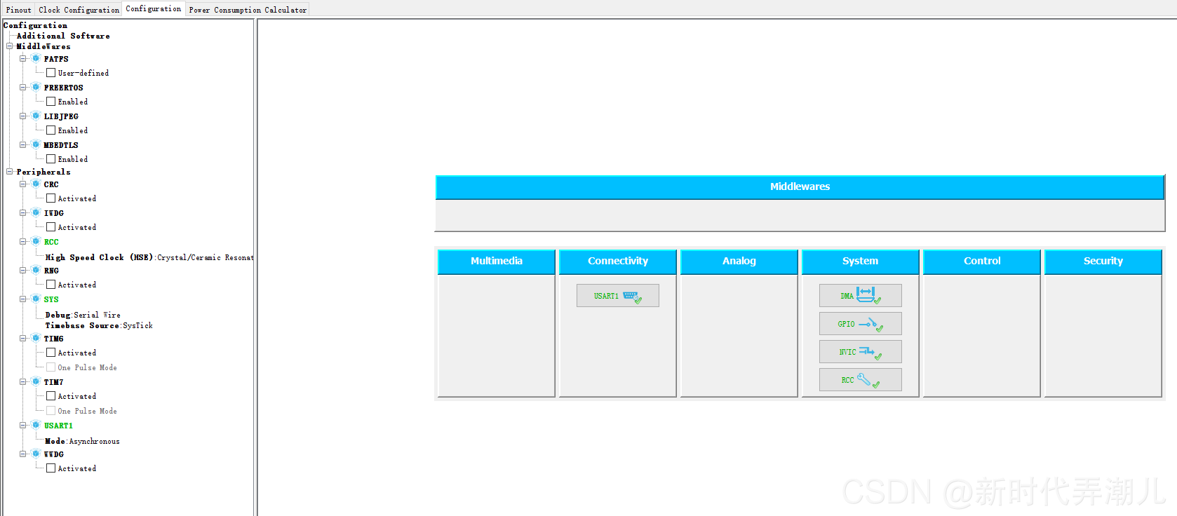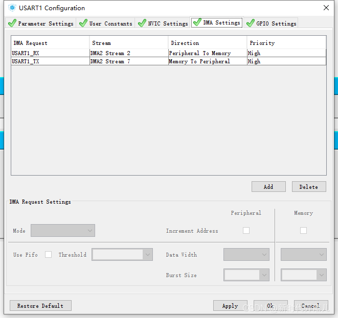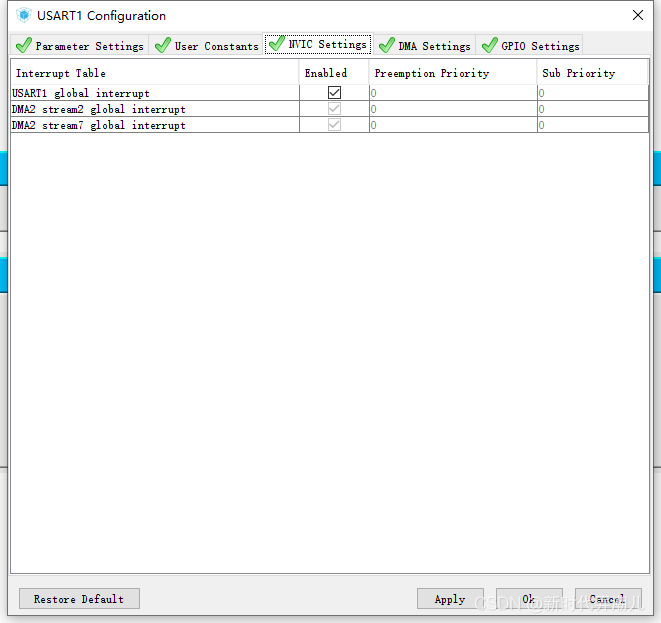 - 主要设置一个串口 USART1 使能能串口接收中断 开启DMA传输,用于通讯