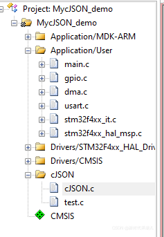 解压cJSON源码包,将cJSON.c cJSON.h test.c 三个文件复制到工程文件中并添加到工程中