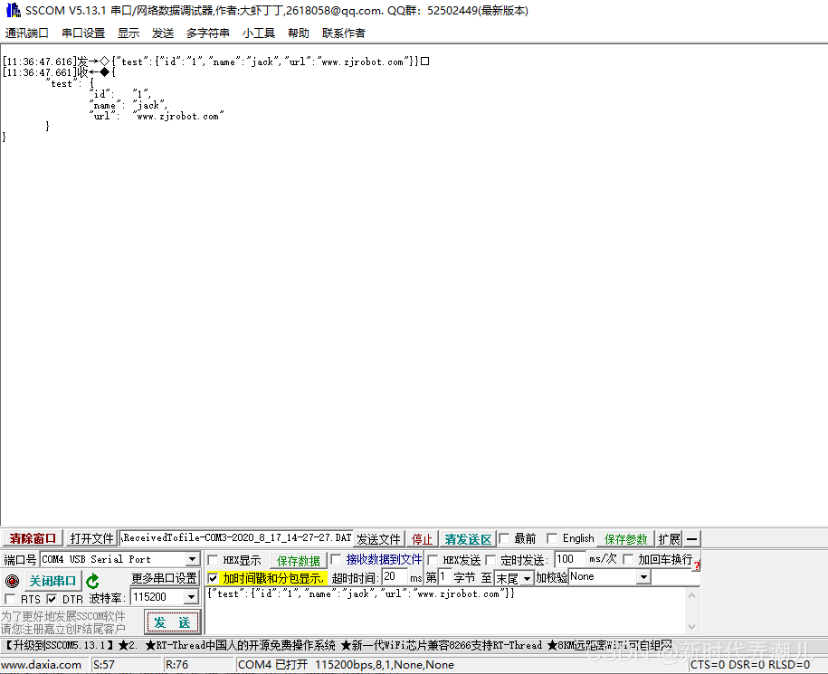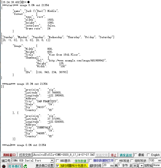 连接串口后,发送如下json数据可以看到串口打印接收到得到数据
