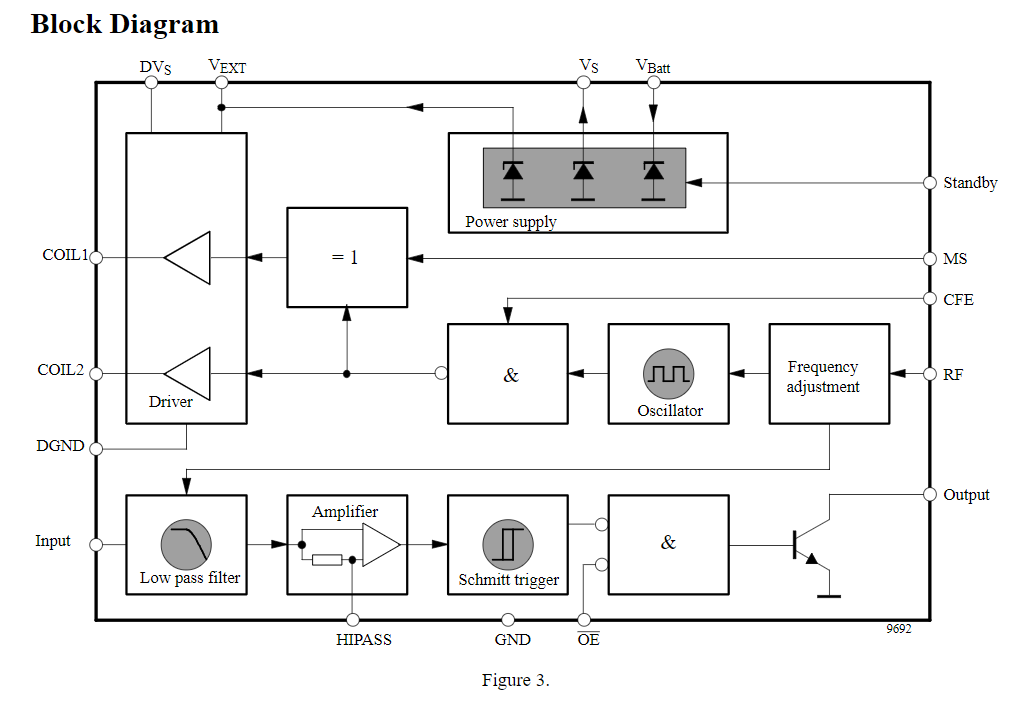 特点: 1.载波频率为100Khz~150KHz 2.在125KHz时高达5Kbaud的数据速率 3.适用于曼切斯特编码和双相编码调制 4.由汽车电池或5V稳压电源供电 5.拥有微控制器兼容接口 6.待机模式下低功耗 7.电压输出为微处理器供电