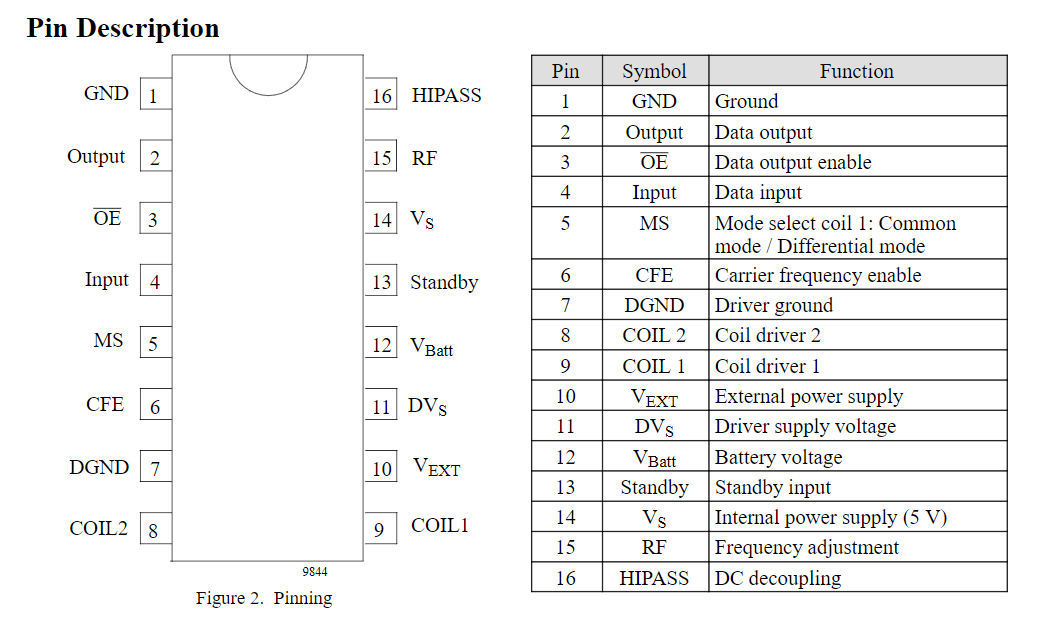 GND | 接地 | Output | 数据输出 | OE | 使能 | Input | 数据输入 | MS | 模式选择 | CFE | 载波使能 | DEND | 驱动器接地 | COIL2 | 驱动器2 | COIL1 | 驱动器1 | Vext | 外部电源 | DVs | 驱动器电源 | Vbett | 电池电压接入 | Standby | 低功耗控制 | Vs | 内部电源 | RF | 载波频率调节 | HIPASS | 调节放大器增益带宽参数 |