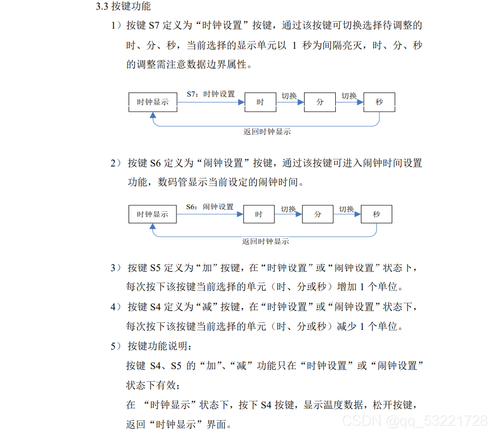 题目用到的是一个独立按键,s7可以时钟的调整时、分、秒,就可以定义一个变量mode1,当mode1为0显示时钟,为1时钟的时开始以一秒为间隔闪烁,为2分开始以一秒为间隔闪烁,为3秒开始以一秒为间隔闪烁。s6定义一个变量mode2,功能和s7一样。s5、s4就是加减,但是只有在时钟或闹钟的时分秒闪烁时有用。另外s4还有一个功能在时钟显示界面(也就是mode1==0)按下显示温度,松开回到时钟显示界面。