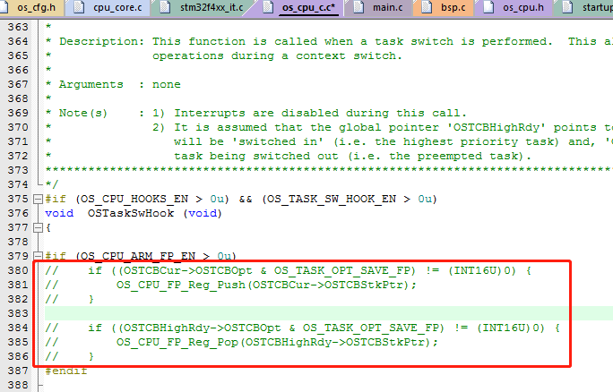 注释os_cpu_c.c文件中(380行到386行),注释 #if (OS_CPU_ARM_FP_EN == DEF_ENABLED) 与 #endif之间的所有内容(317-354行)