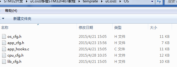 将该路径下的app_cfg.h、app_hooks.c、cpu_cfg.h、li b_cfg.h、os_cfg.h文件复制到\template\uCOS-II\OS文件夹下,OS为新建文件夹