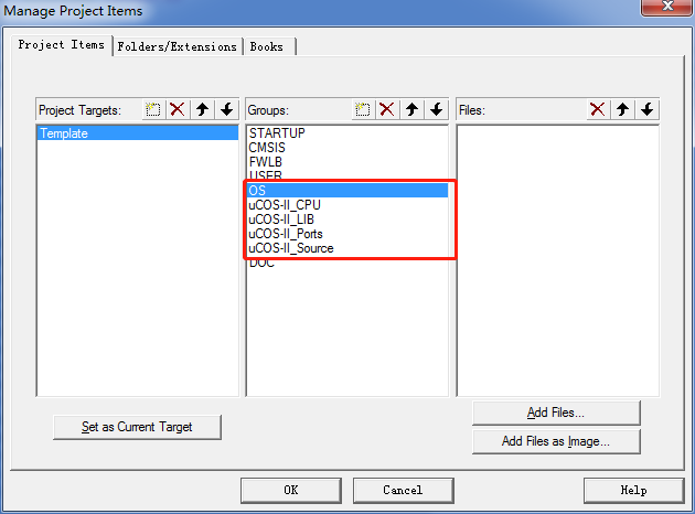 打开工程模板,创建如下五个分组OS、uCOS-II_CPU、uCOS-II_LIB、uCOS-II_Ports、uCOS-II_Source: