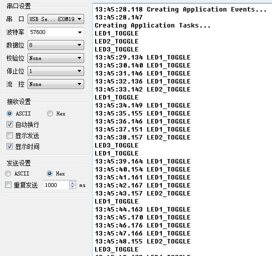 测试程序是创建了一个启动任务和用串口模式控制三个led状态翻转的任务,翻转周期分别为1s,5s,10s,运行现象如下