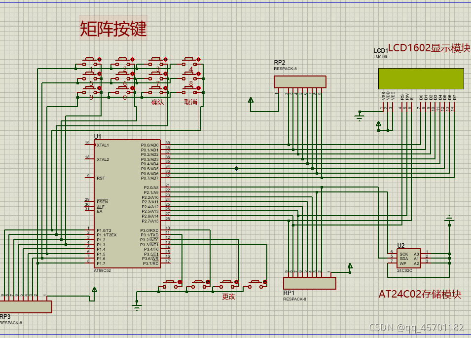 基于51单片机,利用到的模块有:按键模块,AT24C02存储模块,LCD1602显示模块 一、具体功能如下: 1、矩阵按键输入密码,并显示在屏幕上,按下确认键,密码正确显示OK,错误显示ERR 2、独立按键按下,进入更改密码模式,需输入正确密码后才可以输入新的密码 3、清空输入按键,用于输入错误数字后清除输入 二、原理图: