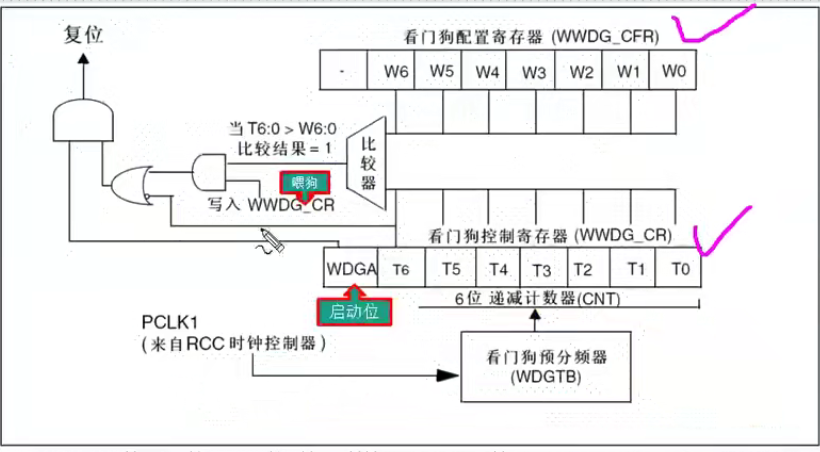 窗口看门狗时钟来源PCLK1 (APB1总线时钟)分频后。