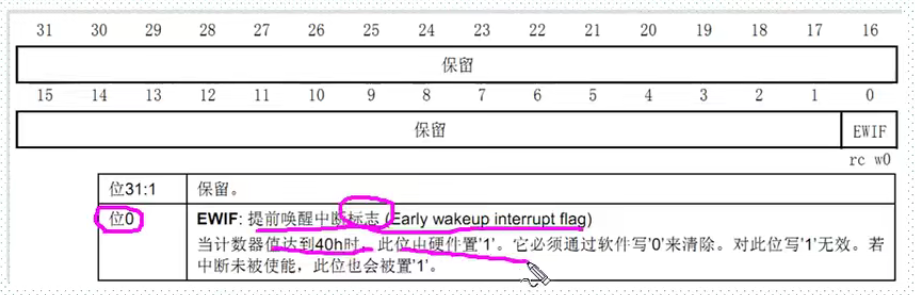 *如果启动了看门狗并且允许中断,当递减计数器等于0x40时产生早期唤醒中断(EWI),它可以用于喂狗以避免WWDG复位(提醒功能)