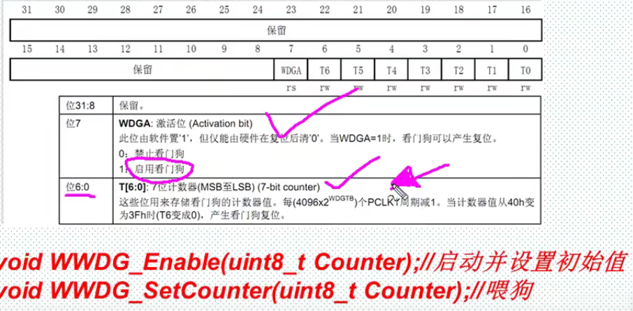 注:void WWDG Enable(uint8 t Counter);这条语句不仅使能了看门狗,并且赋予初值
