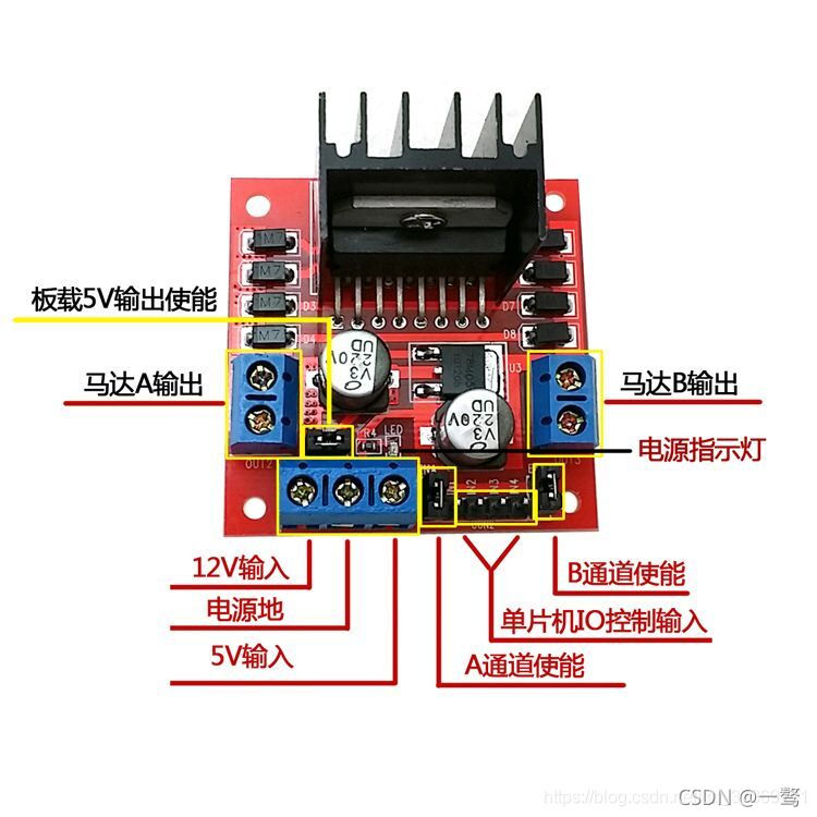 ?该模块可以同时给单片机和电机供电? ? ? ? ? ? ? ? ? ? ? ? ? ? ? ? ? ? ? ? ? ? ? ? ? ? ? ? ? ? ? ? ? ? ? ? ? ? ? ? ? ? ? ? ? ? ? ? ?驱动各部分的简介:输出A,B分别接左右马达,放大电流使马达工作,? ? ? ? ? ? ? ? ? ? ? ? ? ? ? ? ? ? ? ? ? ?? 单片机IO控制输入(即IN1-IN4):接单片机IO口,由单片机的程序控制电机正反转,PWM控制车速。? ? ? ? ? ? ? ? ? ??