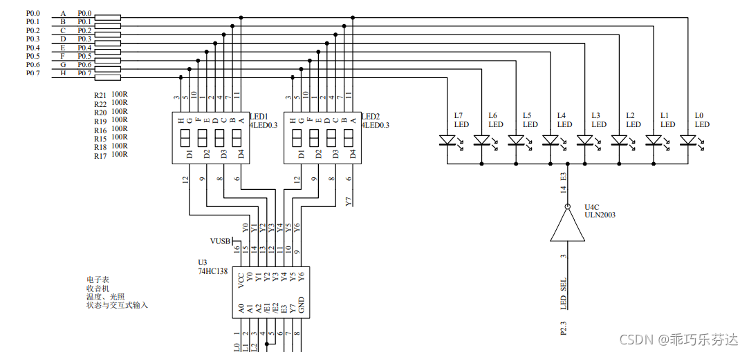 由原理图不难看出,8个led灯是由P0口和P2.3引脚控制的。为点亮发光二极管,首先需要把P0口和P2.3设置为推挽输出,然后将P2.3置“1”(反向后为“0”),使能发光二极管电路;?