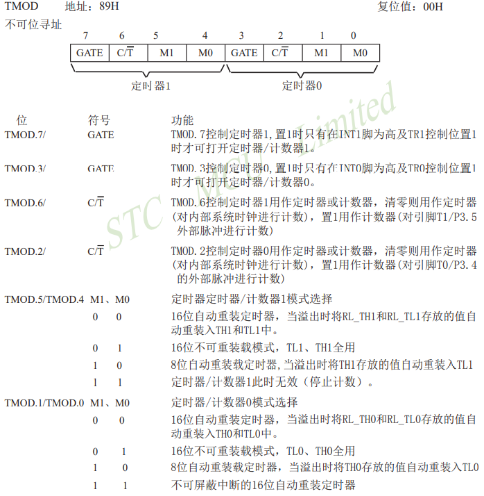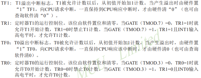 每个16位定时/寄存器又分别由两个8位专用寄存器组成。其中TH0、TL0(对应定时器0)、TH1、TL1(对应定时器1),其访问地址依次为8AH-8DH。它们可单独访问,主要用于装载定时或计数的初始值。