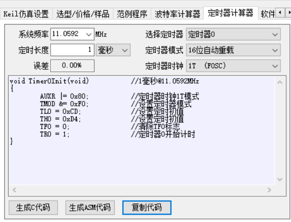 定时器赋初始值计算:如果需要需要定时为50MS,则计算方式如下:如果晶振是12MHZ,则机器周期为12MHz除以12,就是1MHz,每秒1000000次机器周期,那么50ms就是50000次机器周期。65536-50000=15536(3cb0),TH0=0x3c,TL0=0xb0。1ms就是1000次机器周期。(65536-1000)/256是高位,(65536-1000)%256是低位。也可以用STC-ISP直接计算得到如下图: