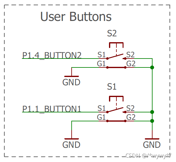 ? 这里使用按键来实现引脚输入功能,通过判断按键的输入来控制LED的亮灭。根据原理图可以得知两个按键一个连接在P1.1上,另一个连接在P1.4上。但是外部的连接电路只有孤零零的一个按键,显然这是不够的,需要一个上拉电阻来保持初始的高电平状态,不然引脚会处于一个不确定的状态,不便判断按键是否按下,这就需要使用芯片的内部上拉电阻。