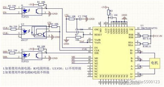 这次作品主要采纳TB67S109A电机驱动器。TB67S109A是一种配备PWM斩波器的两相双极步进电机驱动器,内置时钟解码器。特征有以下几点: 1. 能够节制一台双极步进电机; 2. 能够用PWM来节制恒流驱动; 3. 容许全步、半步、1/4、1/8,1/16、1/32步运行; 4. 差错检测(TSD/ISD)旌旗灯号输出功能; 5. 内置差错检测电路(热关断TSD),过电流关断(ISD),以及上电复位(POR); 6. 可经由过程外电阻与电容自定义电机的斩波频率。 备注:步进电机不能直接接到工频交流或直流电源上事情,而必须应用专用的步进电机驱动器,它由脉冲发生节制单元、功率驱动单元、保护单元等组成。驱动单元与步进电念头直接耦合,也可理解成步进电念头微机节制器的功率接口。 1. TB67S109A驱动电路