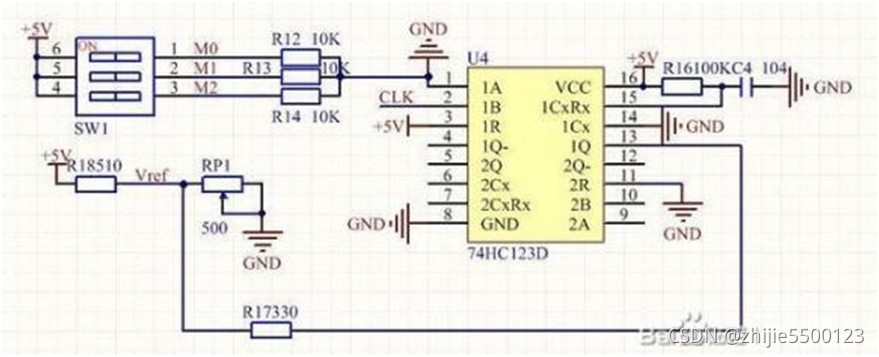 备注:如上图所示,这是一个由74HC123D构成的双重可再触发的单稳态多谐振荡器,它的功能是在没有接管到脉冲旌旗灯号时刻自动将驱动电流降为一半。而M0、M1、M2的感化是选择细分。 3. 电源电路