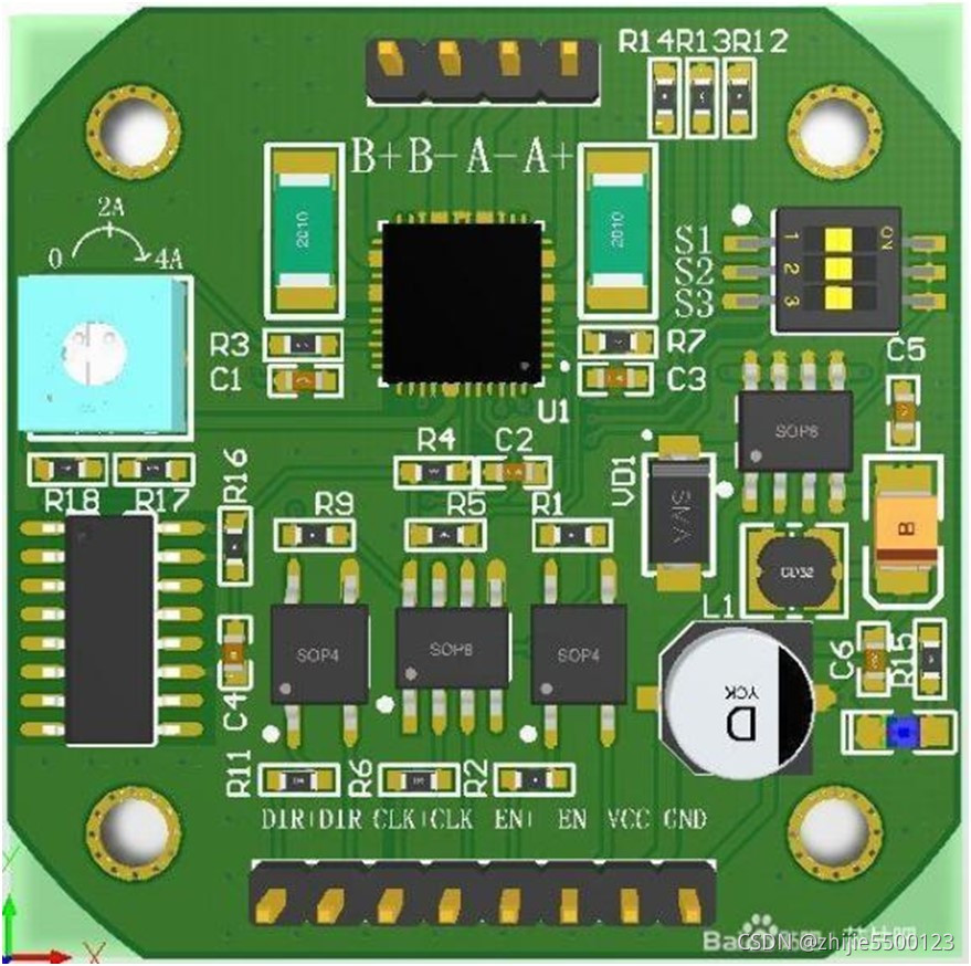 备注:因为单片机事情在5V,而步进电机的事情电压为几十V,以是必要XL1509对电源进行稳压至5V,给单片机提供电压。 PCB什物图: