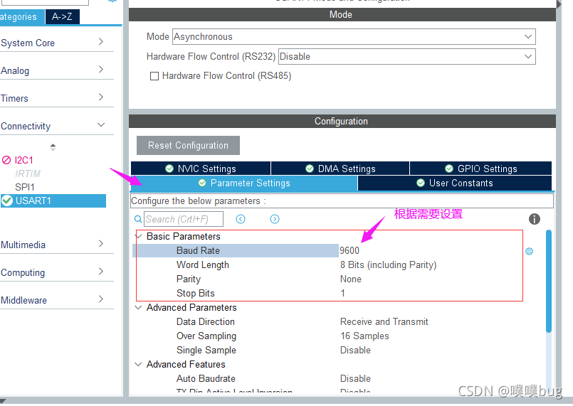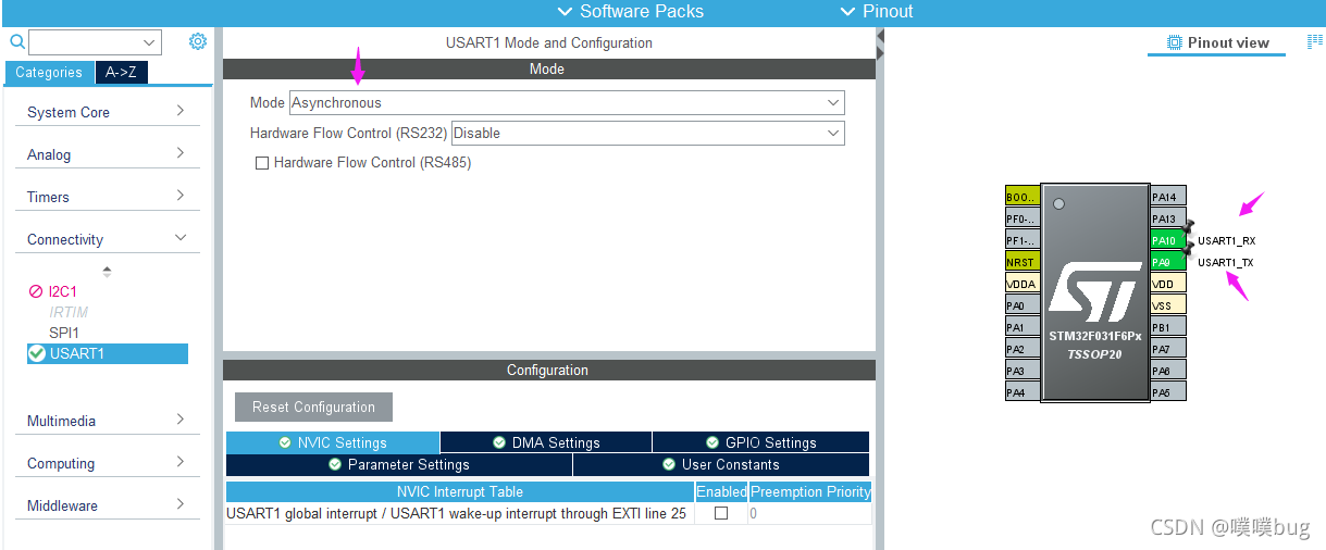 配置 USART1 的模式为 Asynchronous,即异步串口模式