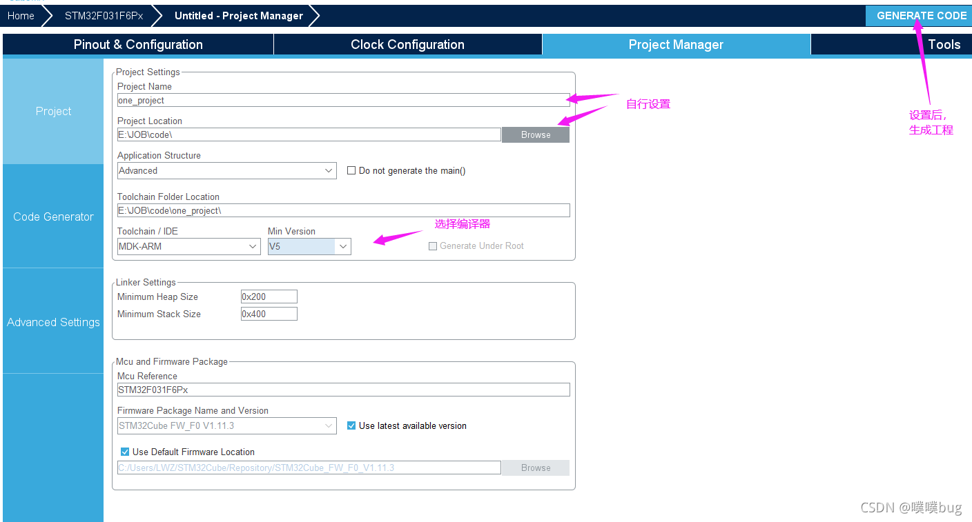 在界面中输入工程名,保存路径,工程 IDE 类型,点 GENERATE CODE?即可。