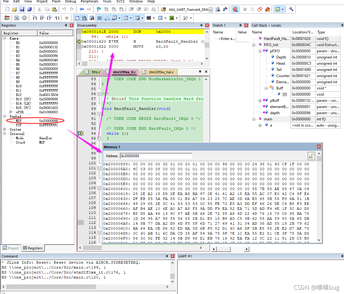 ? ? ? ? 在代码调试是,发现在执行fifo_init初始化,会进入HardFault_Handler,