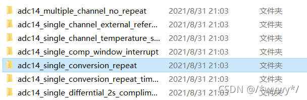 ? MSP432P401R的SDK中也给了不少的例程,可以在Resource Explorer中查看。但是不知道为什么一觉醒来Resource Explorer中少了很多的文档。所以我只能在文件夹中查看,有些不太方便。我们可以看到,给的例程还是非常多的,各种ADC采样方式都实现了一遍。下面来实现一下选中的这个,单通道重复采样。