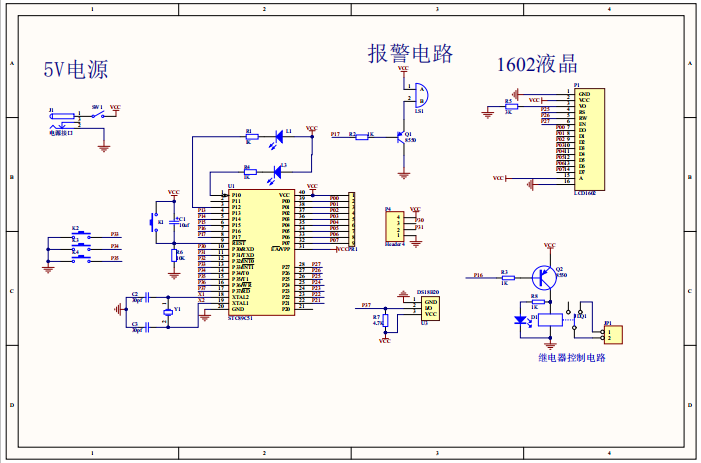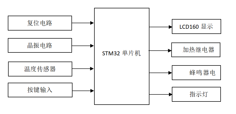 本设计主要以51单片机系统进行温度采集与控制;温度信号由数字温度传感器DS18B20采集,主控器主动获取传感器温度值,通过PID算法,与设置温度进行计算,输出继电器的控制状态,并在LCD显示屏进行显示。 主要由51单片机+最小系统+LCD1602液晶显示模块+DS18B20温度传感器+继电器电路+蜂鸣器模块+LED指示灯模块+按键模块;如图: